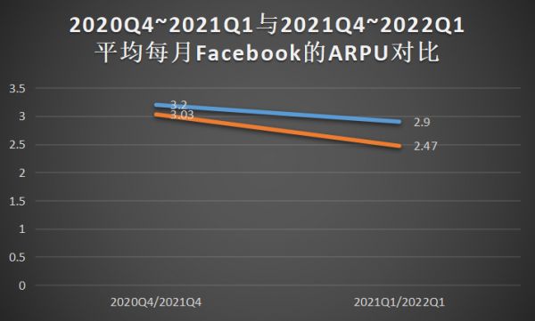 更重要的是,Facebook 的年龄结构一直在“变老”。虽然 TikTok 的用户普遍被认为购买力差,但毕竟他们年轻人是未来,购买力会上涨,如果真的沉淀社交关系在里面,还是挺令竞对头痛的。而对比来看,Facebook 也确实出现了单个用户贡献收入下降的现象。笔者对比了 2020 年 Q4~2021 年 Q1 和 2021 年 Q4~2022 年 Q1 两个时间段里 Facebook 平均每个月的 ARPU 数据(由于财报中没有直接公布 ARPU 的数据,笔者通过每个财季平均每个月的广告收入比用户量计算出的 ARPU),发现整体上后者要低于前者。