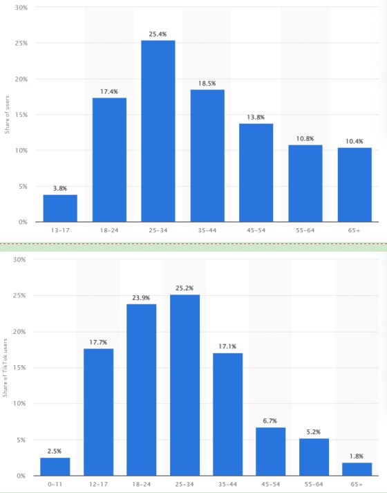 如上面的两图所示,2022 年 Facebook 和 TikTok 45~65+岁用户群体占比之比为 13.7%:35% | 图片来源:Statista