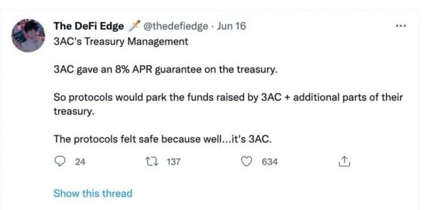Luna崩盘之后,很多机构不愿再向三箭资本借出资金,并且要求它追加保证金,很多此前购买了三箭理财产品的机构也开始要求赎回资金。但问题是,此时的三箭账上根本拿不出这些钱。上周早些时候,关于三箭资本流动性危机还处于传言状态,直到周二其创始人发布了一条推特表示“正在跟相关方处理这些问题”,几乎印证了市场的猜测,导致恐慌开始大范围蔓延。