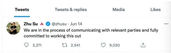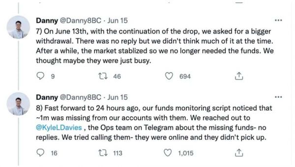 更危险的信号是,三箭还被曝出私自挪用用户资金填补窟窿。上周,知名做市商8 blocks capital的联合创始人Danny在推特发布长文,表示三箭资本私自违反了协议在没有告知他们的情况下挪走了8BC账户上的100万美金,并且三箭方面对此没有任何回复几乎处于失联状态。