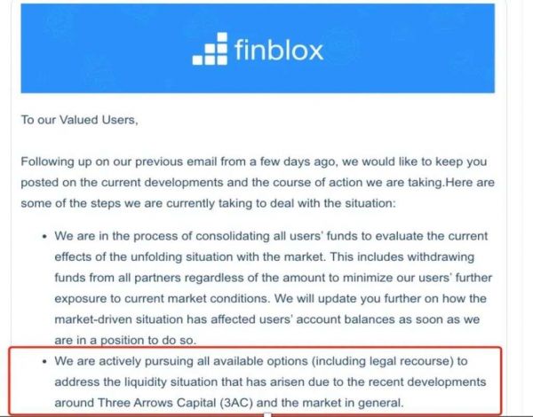 6月19日,加密交易平台Hoo通过 Twitter官方账号宣布将停止提款,表示将在 72 小时内重新开始交易,以便“处理大量用户”。同天,三箭资本支持的加密货币交易平台Finblox暂停了奖励发放并设置了每月不超过1500美元的提款限制,在公告中明确指出三箭资本的业务出了问题。
