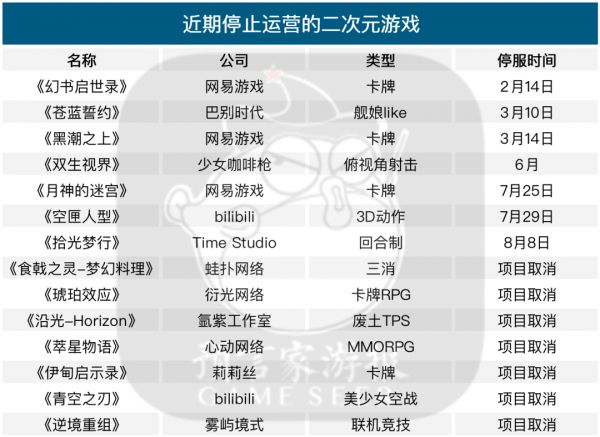 与各家厂商的厉兵秣马形成鲜明对比的是,近半年内一大批二次元游戏纷纷选择停服。 单单最近1个月,就有《月神的迷宫》、《空匣人型》、《拾光梦行》和《双生视界》等四款游戏官宣停运。他们当中运营时间最长的也不过一年,《拾光梦行》上线则不足半年。