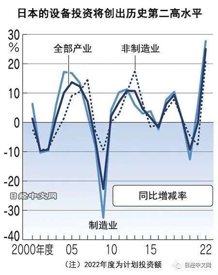 日本经济新闻社(中文版:日经中文网)实施的2022年度设备投资动向调查显示,全部产业的计划额预计比上年度增加25%。增长率创出1973年度以来最高水平,投资额仅次于2007年度,创出历史第二多。很多企业要挽回因供应链混乱等原因而在2021年度搁置的投资,这一动向起到推动作用。对去碳化等的投资引人关注,但如果零部件的供应制约长期持续,投资计划有可能下行。