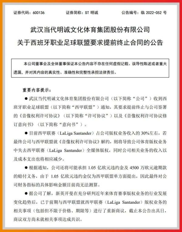 另外一则,是隔了一天后,上市公司当代明诚宣布结束西甲版权合作。当代明诚选择发布公告的时间是晚上8点左右,因为疫情侵袭,搁在以往的重磅消息,已经引不起人们的关注热情。当代明诚放弃西甲版权就是如此。简单来说就是,由于去年的4500万欧元没有支付,西甲联盟终止了版权合作,并要求1.05亿欧元的违约金。