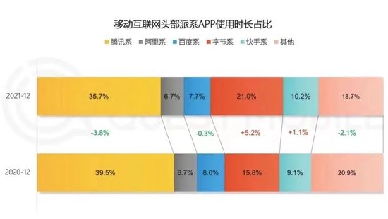 2.在激烈的竞争中,QuestMobile在今年以来取消了各大巨头体系的用户时长占比数据,这个略显敏感的数据暂时定格在了2021年12月。