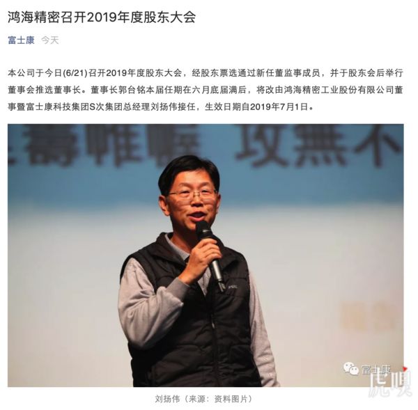 6月21日,鸿海精密召开2019年年度股东大会,经股东票选通过新任董监事成员,并于股东会后举行董事会推选董事长。董事长郭台铭本届任期在六月底届满后,将改由鸿海精密工业股份有限公司董事暨富士康科技集团S次集团总经理刘扬伟接任,生效日期自2019年7月1日。刘扬伟此前担任鸿海半导体次集团总经理、芯片业务负责人。