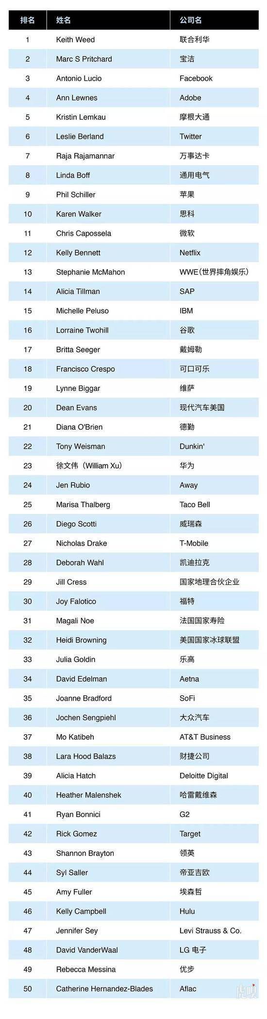 6月21日,福布斯发布了最新的第7期一年一度的全球最具影响力CMO报告(World’s Most Influential CMOs report)。中国企业华为的董事、战略研究院院长徐文伟进入榜单,位列第23名。在50名上榜者中,有28名曾登上2018年榜单,22名初次上榜。50人中有31人为女性,19人为男性。科技公司CMO霸榜,50人中有17人来自此类公司。在所有技术话题中,上榜CMO对人工智能的讨论最多,其次是数字化变革、区块链和5G。