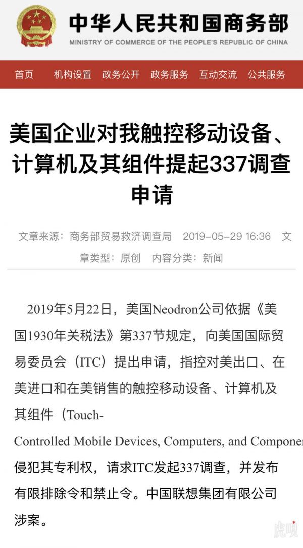 6月19日,美国国际贸易委员会(ITC)决定对触控移动设备、计算机及其组件发起337调查。该调查由美国Neodron公司于5月22日依据《美国1930年关税法》第337节规定向ITC提出,指控戴尔、惠普、联想、微软、三星、摩托罗拉等公司对美出口、在美进口和在美销售的上述产品侵犯其专利权,请求ITC发起337调查,并发布有限排除令和禁止令。中国联想集团有限公司涉案。