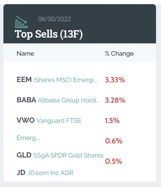 桥水清仓标的达99只,前五大卖出标的包括:新兴市场ETF-iShares MSCI、阿里巴巴、新兴市场ETF-Vanguard MSCI、SPDR黄金ET、京东。其中清仓阿里巴巴748万股,价值8.139亿美元;京东214万股,价值1.239亿美元。此外,被桥水清仓的中概股还包括网易、哔哩哔哩和滴滴等。