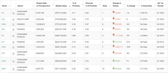 前十大重仓股中,其他分别是iShares标普500指数ETF、新兴市场ETF-Vanguard MSCI、百事公司、Costco以及沃尔玛。