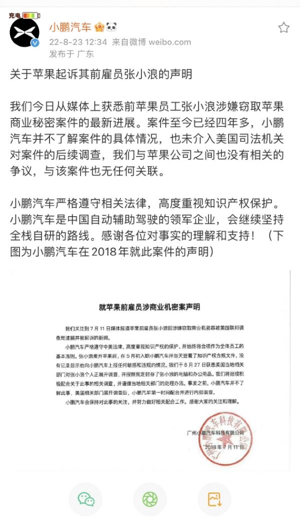我们今日从媒体上获悉前苹果员工张小浪涉嫌窃取苹果商业秘密案件的最新进展。案件至今已经四年多,小鹏汽车并不了解案件的具体情况,也未介入美国司法机关对案件的后续调查,我们与苹果公司之间也没有相关的争议,与该案件也无任何关联。