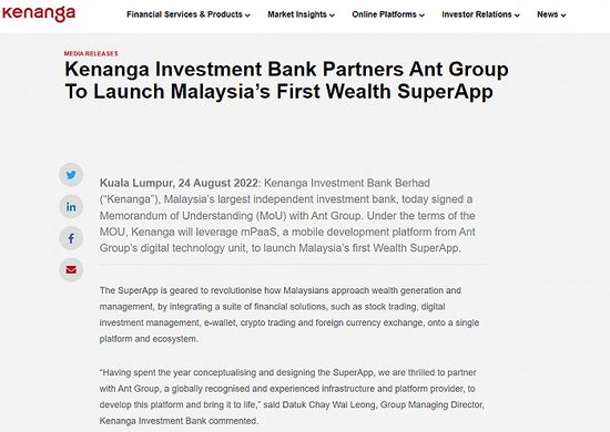 马来西亚最大独立投行肯纳格投资银行8月24日在官网发布声明,宣布同蚂蚁集团签署谅解备忘录,将借助蚂蚁的移动开发平台mPaaS推出理财应用程序Wealth SuperApp。
