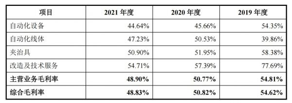 分产品来看,除自动化线体外,其他各项主营业务的毛利率均不断走低。公司称,自动化设备毛利率呈下降趋势,主要是因受市场竞争加剧的影响,产品销售价格持续下降,且价格下降的幅度大于成本。据招股书,2019年-2021年,智信精密自动化设备平均销售价格分别为28.04万元/台、32.85万元/台、25.48万元/台;夹治具平均销售价格分别为1.06万元/套、0.71万元/套、0.65万元/套。