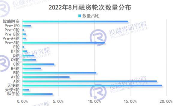 从融资轮次数量分布来看,获得天使轮融资的创业项目数量最多。8月天使轮融资案例数量83起,占比19.39%。同样融资数量较多的还有获得A轮融资的企业和战略融资的企业。A轮融资80起,占比18.69%。战略融资63起,占比14.72%。