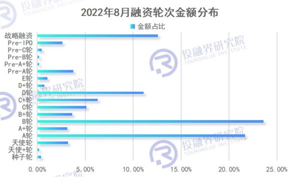 融资金额方面,A轮和B轮融资表现亮眼。8月融资总额最多的是获得B轮融资的企业——融资金额152.06亿元,占比23.59%。B轮融资的企业在数量占比10.28%的情况下却是收获融资金额最高的轮次,离不开大额融资的支持。成功获得该轮融资的维泰瑞隆、享道出行、原启生物、原能医学这四家企业,融资金额均在8亿人民币以上。