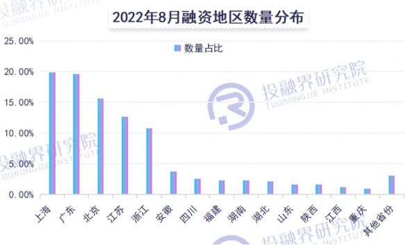 从融资数量上看,上海已经摆脱上半年疫情带来的不利影响,超越7月的榜首广东,成为8月融资事件发生最多的地区。8月上海的企业发生融资事件85起,数量占比19.86%。广东与北京紧随其后,融资事件分别有84起和67起。值得注意的是,全国范围内,8月份这三个地区的融资数量占比之和,已超过全国融资事件数量的一半。
