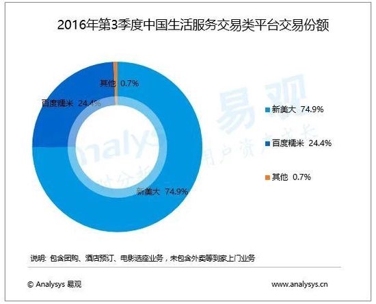 “新美大”诞生以后,O2O市场基本大局已定,到了2016年第三季度,新美大的交易份额已经占到了国内生活服务类交易平台的74.9%,而百度糯米仅剩下了24.4%。