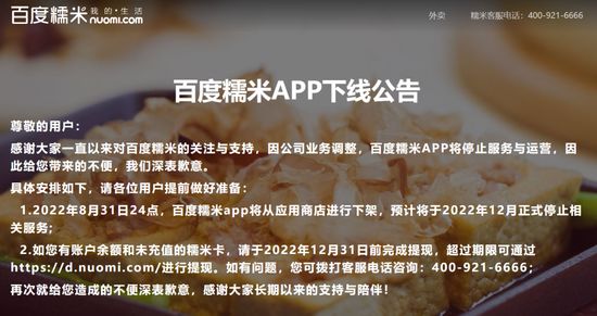 日前,百度糯米App正式发布下线公告,2022年8月31日24点,百度糯米App将从应用商店进行下架,预计将于2022年12月正式停止相关服务。