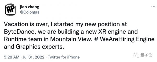 值得一提的是,今年7月份,前Meta资深图形工程师Jian Zhang发推宣布加入字节团队。