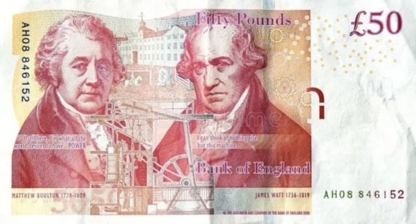 英国央行在2011年的新版50英镑纸钞上,印上了詹姆斯·瓦特和他的投资人、合伙人马修·博尔顿的肖像,配着瓦特蒸汽机和博尔顿的工厂。