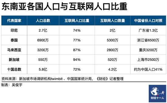 庞大的人口规模会带来足够的商业需求。东南亚十国人口为5.8亿。其中互联网人口超过4.2亿,占比高达72%。印尼人口是广东省的2倍,泰国人口略高于浙江省,马来西亚人口与重庆市齐平。