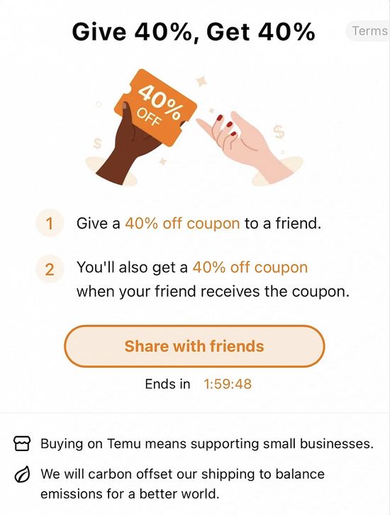 在部分社交平台上,已经出现了Temu老用户的拉新链接,只要将链接分享给朋友,双方都能享受到40%的折扣,延续了标准的互联网式打法,但相比国内的“砍一刀”方式则收敛很多。