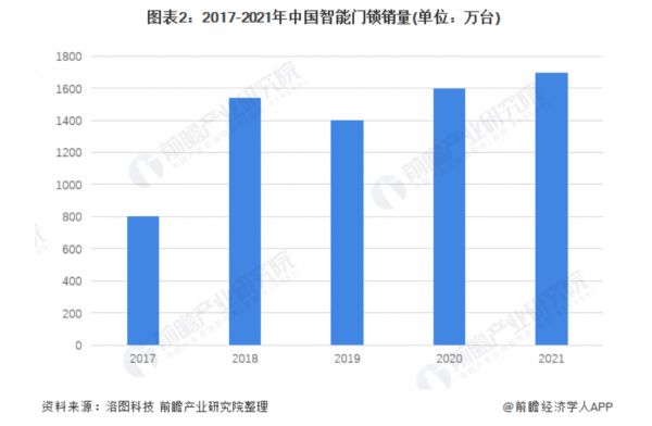 中国智能门锁市场的爆发始于2018年,年销量从800万跃升至1500万以上。随后几年虽然销量略有起伏,但整体上升趋势不变。前瞻产业研究院统计的数据显示,截止2021年底,全国智能门锁销量为1695万台,同比增长5.9%。