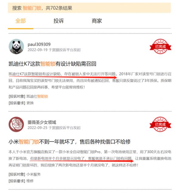 在黑猫投诉平台搜索关键词“智能门锁”,瞬间冒出700多条相关投诉,无论大品牌还是小厂商都未能幸免,全都沦为消费者吐槽的对象。