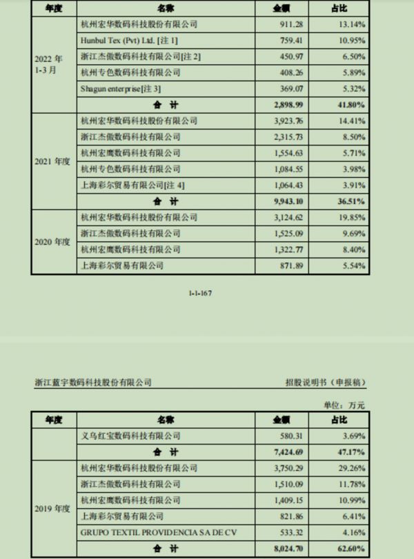 值得一提的是,宏华数科已于2021年7月在科创板上市,部分募集资金将用于数码印花墨水项目。经济学家宋清辉认为,若未来蓝宇股份不能通过研发投入、技术创新保持行业领先地位,并进一步提高技术壁垒、降低产品成本,则有可能面临宏华数科等客户向产业链上游拓展导致订单流失的风险。另外,2022年4月宏华数科收购天津晶丽数码科技有限公司67%股权,天津晶丽数码科技有限公司成为宏华数科控股子公司,报告期内天津晶丽数码科技有限公司为蓝宇股份的供应商之一。这也意味着今年4月之后的交易,宏华数科有着客户与供应商的双重身份。