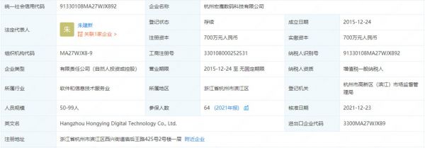企查查显示,杭州宏鹰数码科技有限公司成立于2015年12月24日,注册资本700万元。从时间上推算,杭州宏鹰数码科技有限公司成立后,就与蓝宇股份“闪电”开展合作。