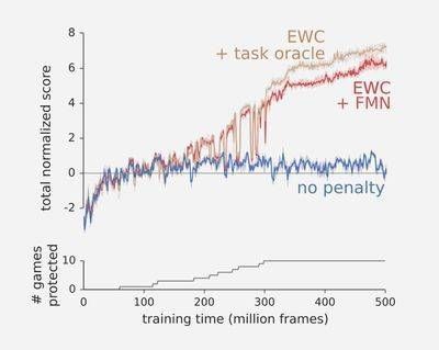 蓝线=标准深度学习,红色和棕色线=在EWC的帮助下进行改进