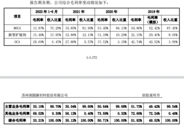 对此,湘园新材在招股书中称,主要原因系 MOCA 的主要原材料邻硝受到上游产能紧张等因素的影响,采购价格涨幅较大,使得单位原材料成本大幅提升,单位成本上升了 67.94%。 在此背景下,公司提升产品售价以抵御原材料成本上升的压力,销售均价提升了 21.85%,但售价提升幅度不及成本上升幅度,使得 2021 年 MOCA 产品的毛利率下降较大。