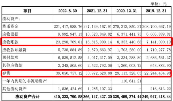 招股书显示,报告期内,公司应收账款逐步上升,2019年至2022年上半年分别为714.11万元、835.34万元、1681.59万元、2329.88万元。与此同时,公司应收账款周转率呈现下降趋势。报告期各期末,公司应收账款周转率为35.65次、33.63次、26.44次、19.52次。报告期各期末,存货分别为2224.44万元、2911.3万元、3097.26万元和 3905.08万元,呈现逐年上涨趋势。