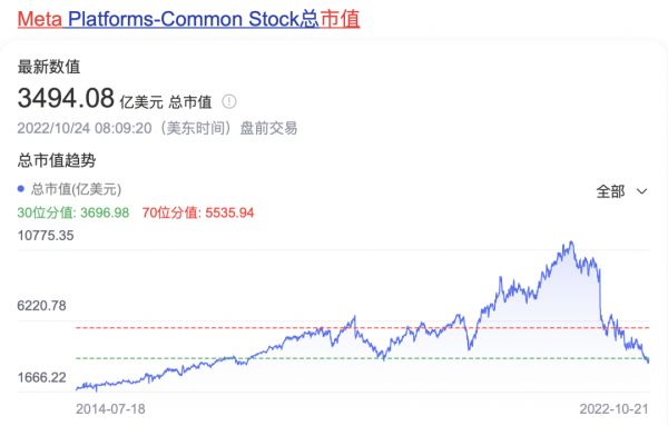 随着各类消息应声而降的是Meta一泻千里的市值,截至10月24日美股盘前交易时,Meta的股价已经跌至3494亿美元,比其去年10月28日宣布改名Meta前的9128亿美元市值,整整下降了61.6%。