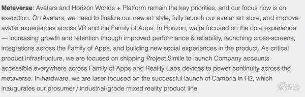 在今年7月的一份备忘录中,Meta曾提到Horizon Worlds+Platform(元宇宙会议/社交平台)将成为今年最主要的项目。