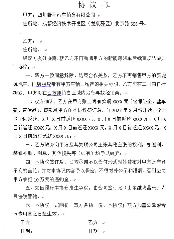 雷丁汽车与经销商解约协议 图源:内部人士提供