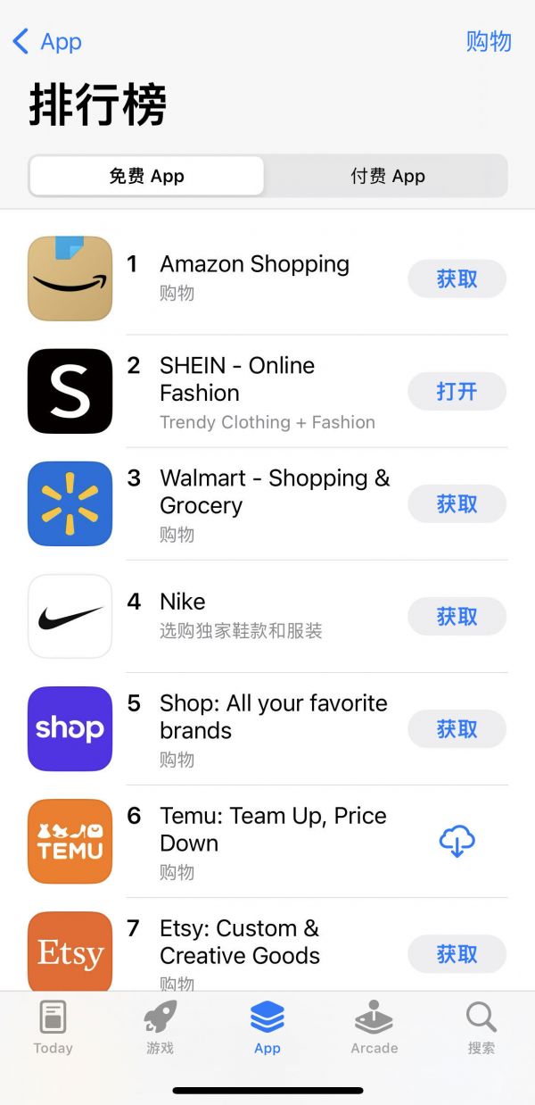 Temu在美国苹果商店购物类APP中排名
