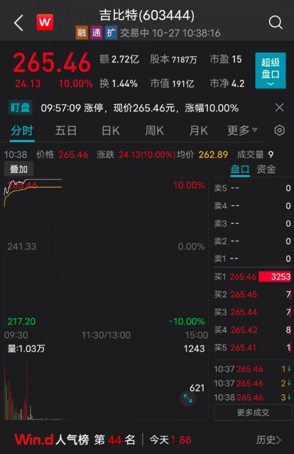受消息影响,27日早盘吉比特快速涨停,收报每股265.46元。