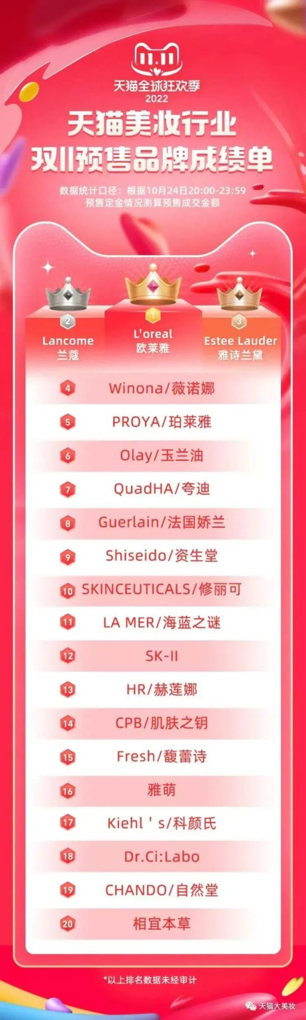 天猫大美妆发布的成绩单显示,欧莱雅、兰蔻、雅诗兰黛分别位居天猫美妆行业双11预售品牌TOP榜前三,国产品牌薇诺娜、珀莱雅紧随其后。此次功效护肤品牌夸迪、美容仪品牌雅萌以及传统国货品牌自然堂、相宜本草也挤进了TOP20榜单。