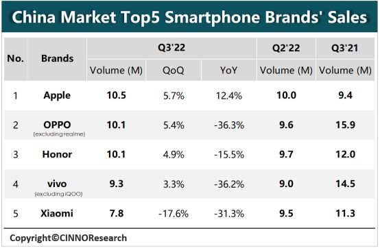 根据CINNO Research数据,9月苹果以约460万部的销量重回国内市场第一,同比增长26.8%,环比增长68.4%,实现环比、同比双增长,也是前五大品牌中唯一同比、环比正增长的厂商。