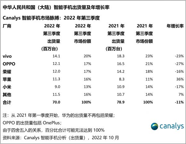 根据Canalys数据,2022年三季度,国内排名第一的vivo出货1410万台,同比下滑23%;OPPO(包括OnePlus)出货1210万台,同比下滑27%;荣耀跌至市场第三,出货1200万台,同比下滑16%;苹果位居第四;小米出货900万台排名第五,同比下滑17%。