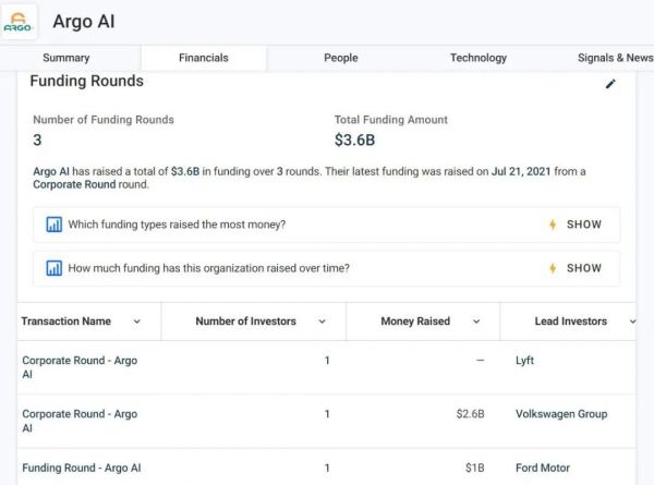 2021 年 7 月,Argo 又接受了 Lyft 数额未公布的投资,该公司最终的融资金额定格在 36 亿美元。