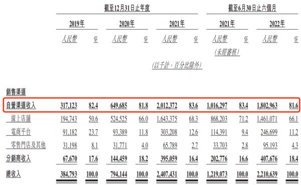 从渠道来看,蕉下一直以自营渠道为主,既能强化品牌形象,还能稳住价格体系。从2019年开始,蕉下八成以上的收入都来自于以线上为主的自营渠道。