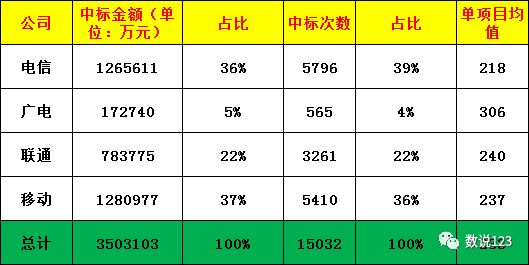 根据政府采购网,数说123平台数据统计了三大运营商2022年上半年公布政企市场成绩单:中国移动中标金额为128亿元,中标项目数量达5410个;中国电信中标金额为126亿元,中标数量5796个;中国联通中标金额为78亿元,中标数量3261个。