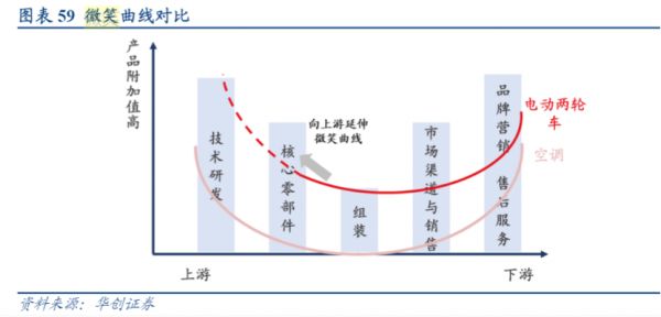 参考微笑曲线较为完整的空调行业,中间组装环节的产品附加值往往最低,但这也是大多数两轮电动车企业的现状,即便是在新造车领域,也有车企表示自己在替电池厂打工。可见,想要获得更多利润,便要将微笑曲线补齐完整,而已经掌握了上游核心组件自研自产的雅迪,将能进一步提升整机厂商盈利能力。