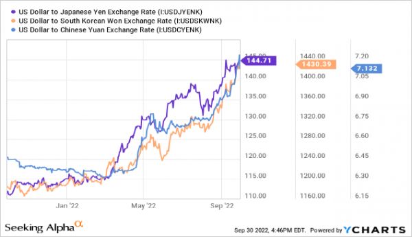下面的图表显示了日元、英镑、欧元、南韩元和人民币对美元的疲软。