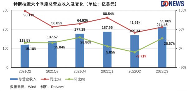 数据显示,第三季度总收入214.5亿美元,同比增长56%,其中汽车销售业务收入180.71亿美元,同比增长54.8%;汽车租赁业务收入6.21亿美元,同比增长61.3%,能源收入11.17亿美元,同比增长38.6%;服务及其他收入16.45亿美元,同比增长84.0%。