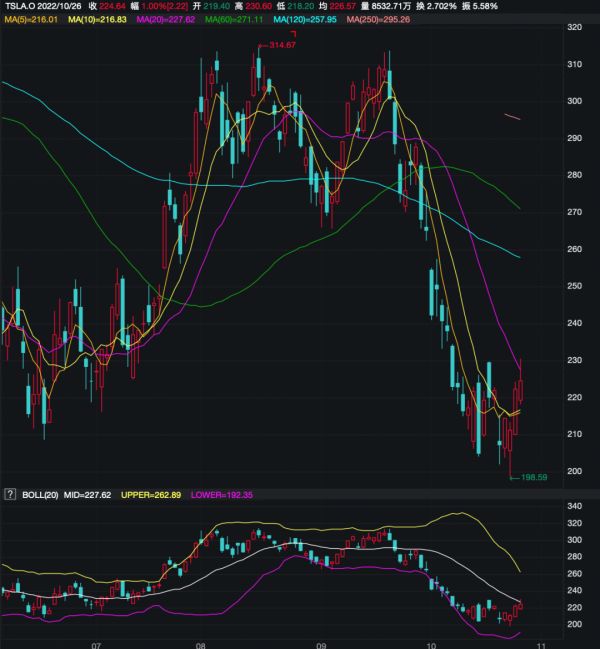 但股市并没有表现出同等的乐观。10月20日,特斯拉早盘跌幅一度达到9%,收跌6.65%,市值也一夜蒸发了466亿美元。从9月21日开始,截至10月26日,特斯拉市值已经蒸发近27%左右。