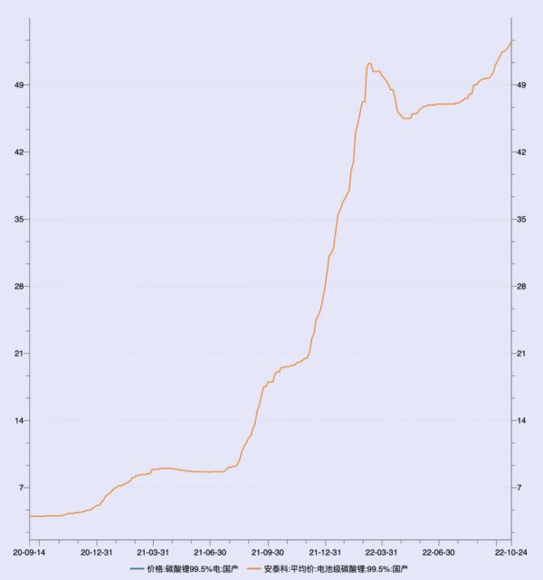 新能源汽车的高速发展拉升了全球范围内对锂盐的极大需求,世界范围内缺锂导致锂盐价格居高不下。数据显示,自2021年年初以来,碳酸锂价格便呈现快速增长趋势,今年3月份便达到51万/吨的高点,之后虽有所下调,但目前价格又再创新高,达到53万元/吨,距离2021年年初的5万/吨,已上涨超10倍。