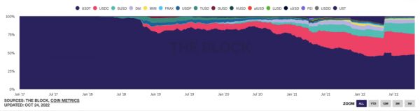 Odaily 星球日报注:The Block 的稳定币份额变化图,紫色部分为 USDT,红色部分为 USDC。